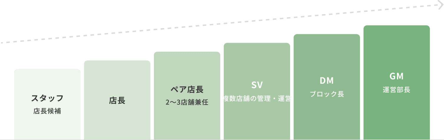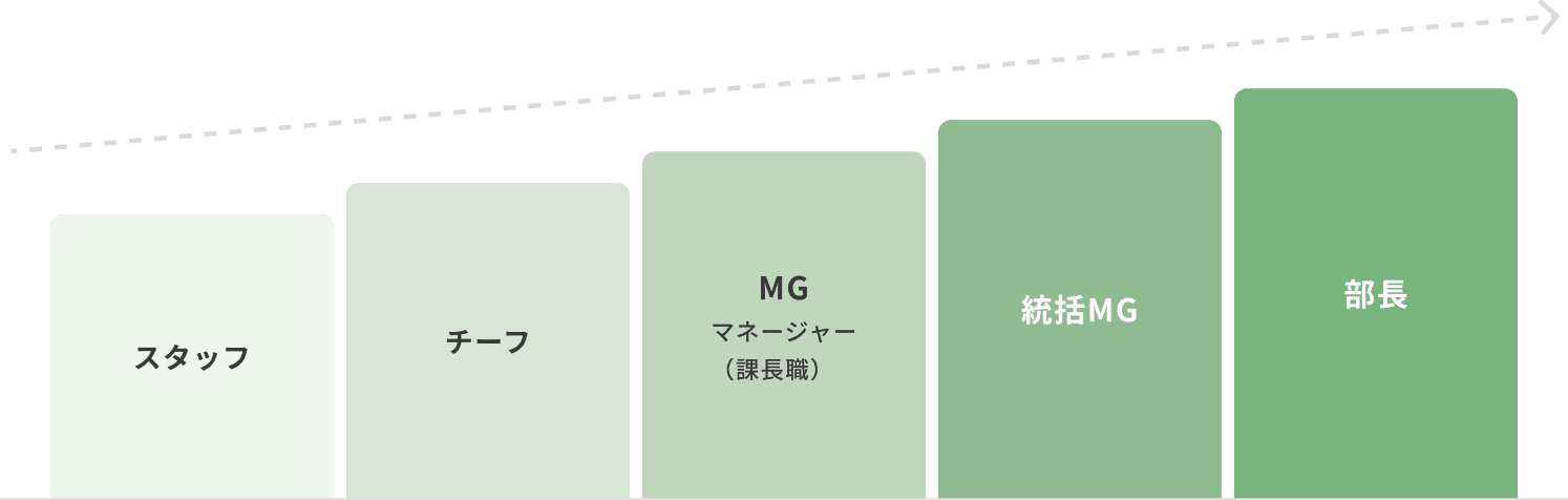 仮)本社では、まずスタッフとして業務の基礎を学び、チーフ・マネージャー(MG)へとステップアップ。その後は、統括マネージャーや部長としてチームを牽引する立場へ成長していきます。経験を重ねることで、企画力やマネジメント力を磨き、組織を動かすやりがいを実感できるキャリアパスが広がっています。